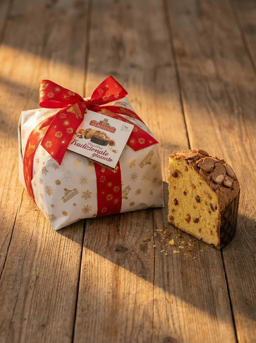 Experience the pinnacle of Italian holiday tradition with this spectacular Panettone from Albertengo. This is "alta pasticceria" (high pastry), crafted in the traditional low Piedmontese style. It is an incredibly rich and fragrant cake, leavened slowly using only natural sourdough yeast and no preservatives, resulting in an unmatched lightness and aroma. The soft, buttery interior is generously studded with plump raisins and candied fruits. The crowning glory is its delicate, crunchy hazelnut glaze, beautifully decorated with whole roasted almonds.